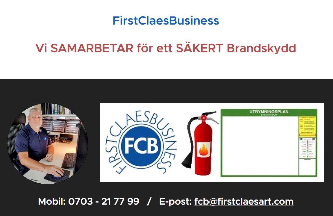 Är ni i behov av att uppdatera Ert Brandskydd, tveka då INTE att höra av Er till mig via E-post: fcb@firstclaesart.com eller via telefon på 0703 - 21 77 99...