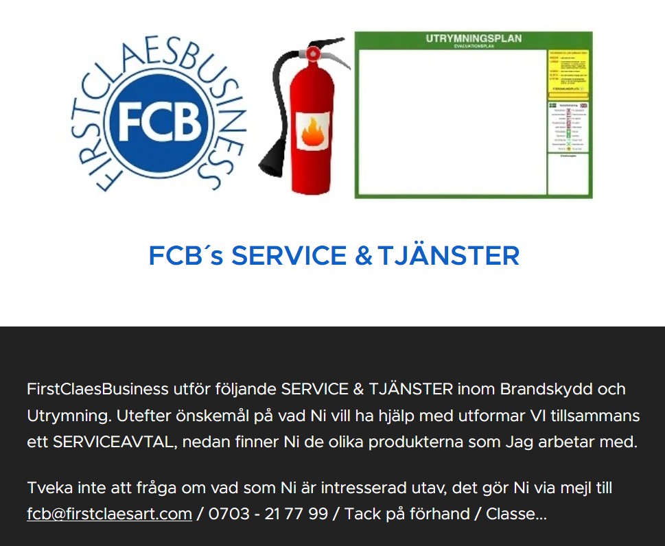 FirstClaesArt´s hemsida har nu fått en NY flik/sida och den heter FCB vilket är lika med FirstClaesBusiness som står för SERVICE & TJÄNSTER inom Brandskydd och Utrymning.